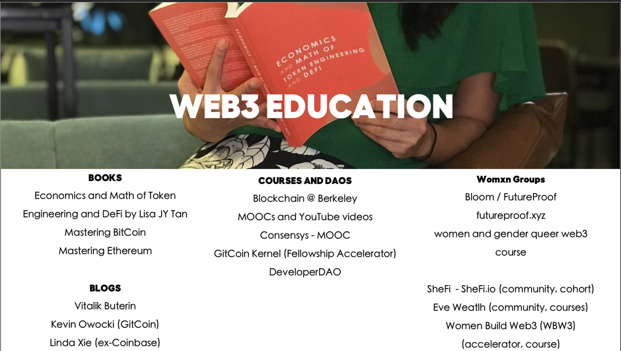 I listed some reference links (and will be adding more to my blog) for women who are getting started and finding support groups in the various subsectors of tech, in AI, metaverse and web3. Here is a brief one for web3 below.
